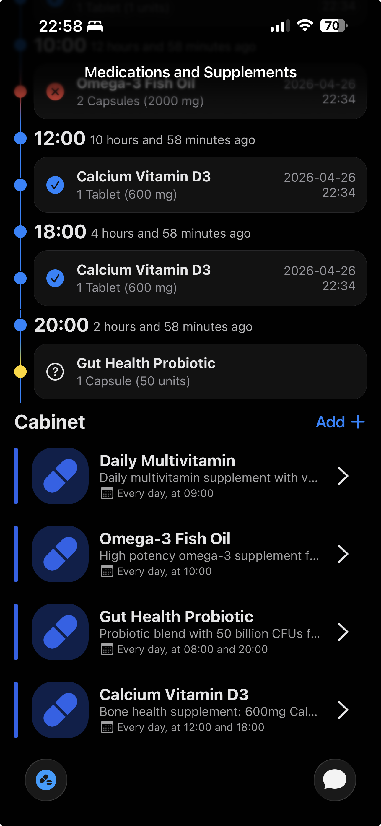First thing to track: what's going into my body. Medications and supplements, with a cycle system when you need on/off patterns. Register it, set a schedule, and the app reminds you and logs everything.